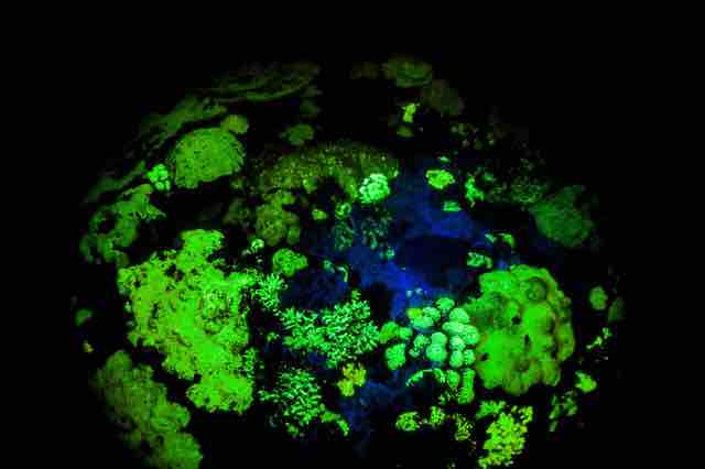 ■青色光を受けて緑色に光るサンゴ=基礎生物学研究所提供